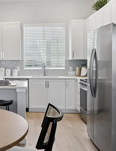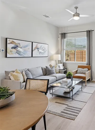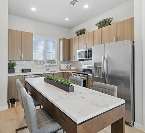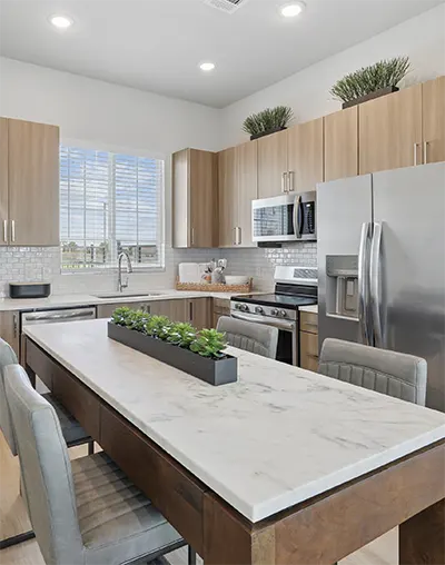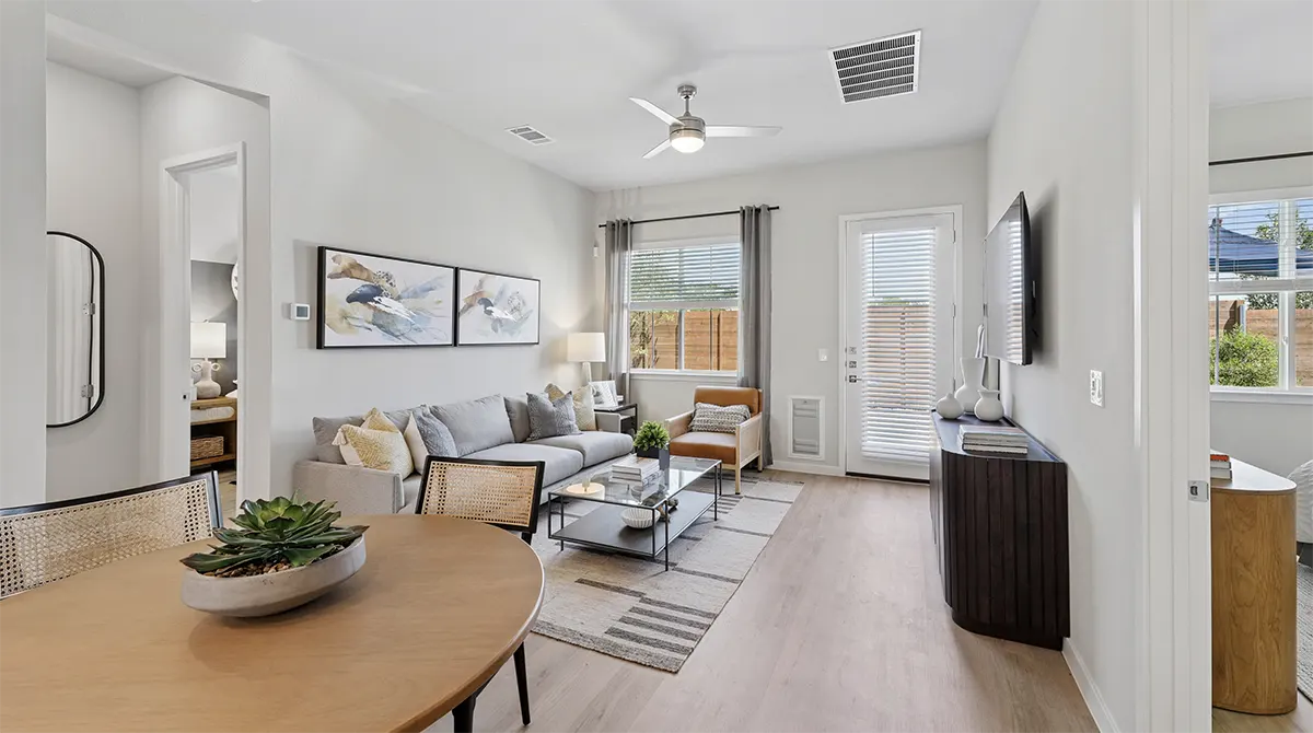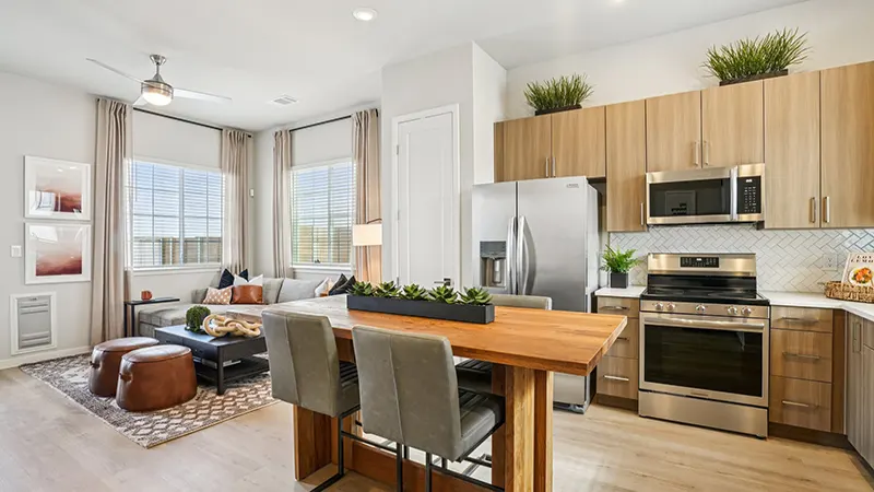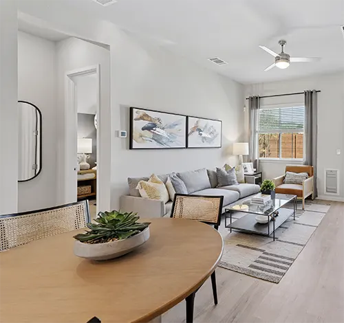 Our single and two-story homes are thoughtfully designed with spacious 1, 2, and 3-bedroom layouts to suit your lifestyle. Enjoy smart home technology, fully equipped kitchens, and the convenience of full-size washer/dryers. Each home features a private backyard, perfect for outdoor relaxation or entertaining, creating the ideal space to balance comfort and functionality.